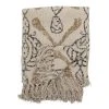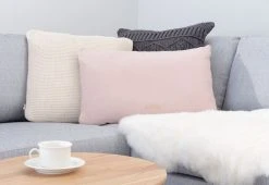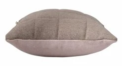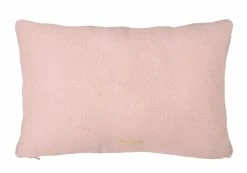 Koristetyynyn toinen puoli vaaleanpunainen ja toinen puoli beige. Beigellä puolella koristetikkaukset. Päällinen 100 % villaa. Tyynyn täyte 100 % polyesteriä.