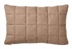 Koristetyynyn toinen puoli vaaleanpunainen ja toinen puoli beige. Beigellä puolella koristetikkaukset. Päällinen 100 % villaa. Tyynyn täyte 100 % polyesteriä.