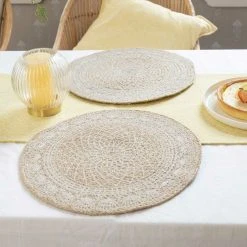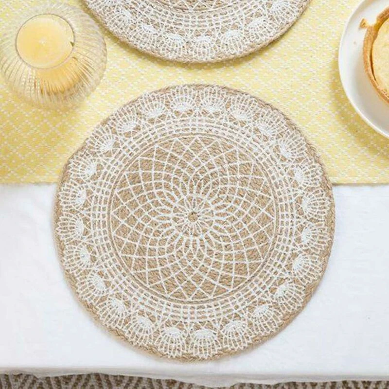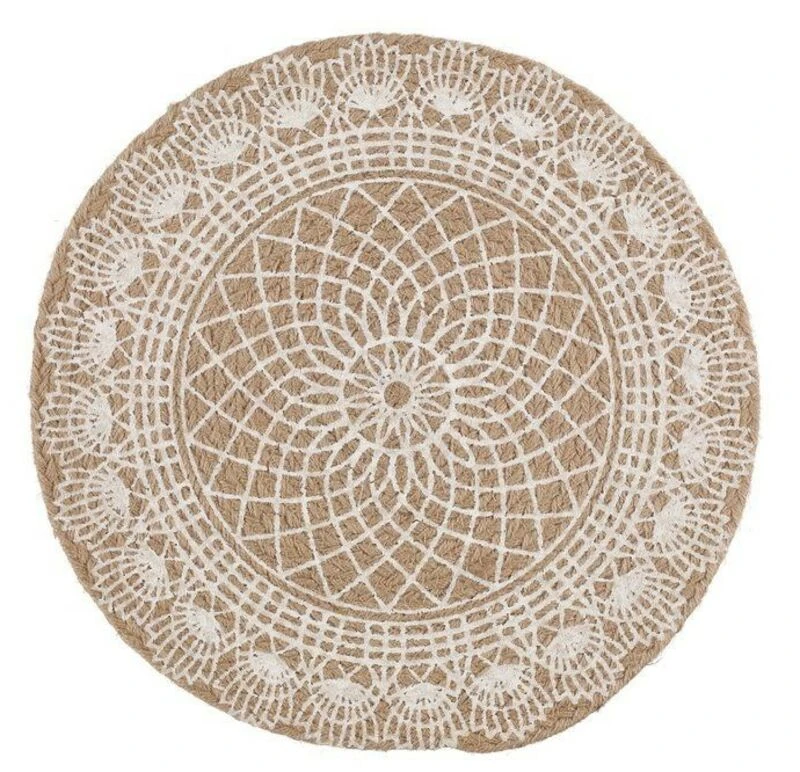 Fanni K Boho tabletissa on kaunis, mandala-henkinen painokuvio, joka sopii erityisen hyvin boheemiin sisustustyyliin. Tablettien avulla luot viehÀttÀvÀn ja rennon kattauksen, mutta se toimii erinomaisesti myös yksittÀisenÀ liinana pöydÀn keskellÀ. Tabletti on kauniisti letitettyÀ juuttia, joka on ommeltu ympyrÀn muotoon.