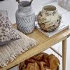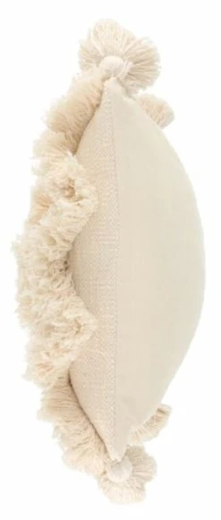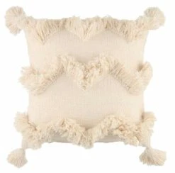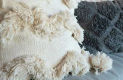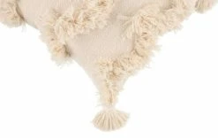 Kaunis Fanni K Viima koristetyyny 50×50 cm. Tyynyssä on pitkällä langalla tuftattu kuvio sekä neljä tupsua. Tyynyn toinen puoli on puuvillakanvaasia. Päällinen on irrotettavissa ja pestävissä varovasti käsin.