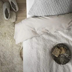 Luhtan Polkka pussilakanasetissä peiton toinen puoli on kaunista kivipestyä vohvelikuvioa ja toinen puoli on sileä. Kivipesty vohvelikangas näyttää hyvältä myös petauksessa, jolloin päiväpeitto ei ole välttämätön. Miellyttävän tuntuinen iholla. Tyynyliina on sileä. Tuotteella on Öko-Tex sertifikaatti. Pussilakanan koko on 150×210 cm ja tyynyliinan 53×60 cm.