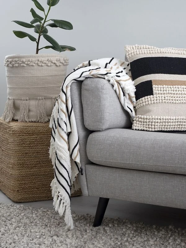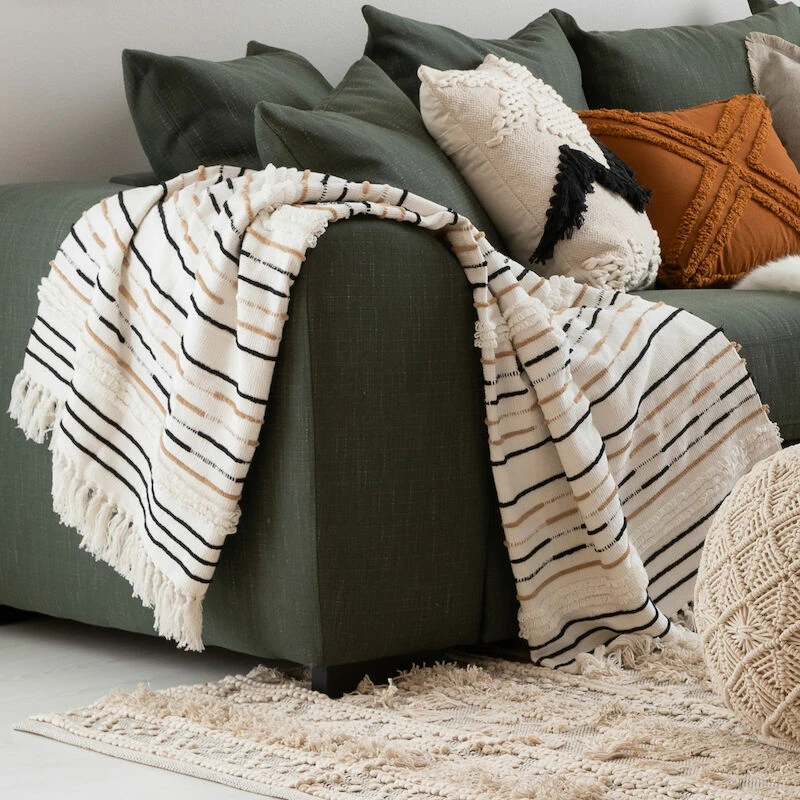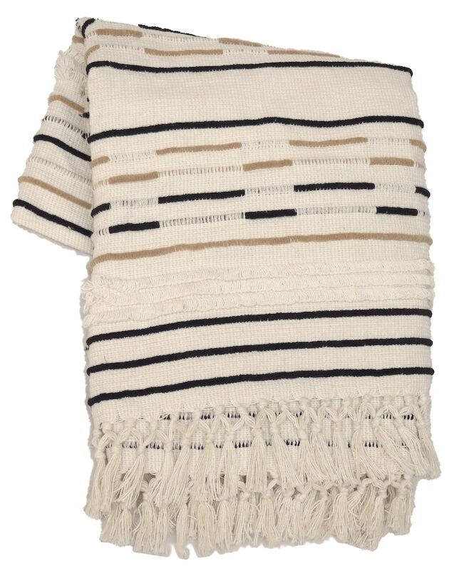 Raidallinen torkkupeitto, johon on mukava kääriytyä lämmittelemään. Peiton molemmissa päissä on hapsut.