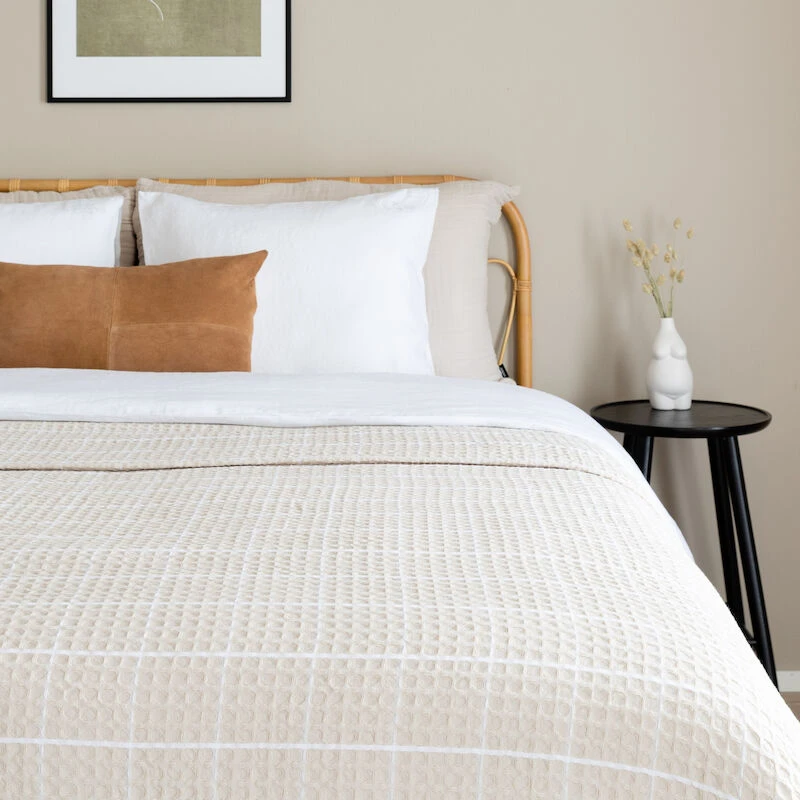 Ruutu päiväpeitto on valmistettu ruudullisesta kudotusta vohvelikankaasta. Päiväpeitto on viimeistyskäsitelty pehmeäksi ja samalla saatu esiin vohvelikankaan kolmiulotteinen rakenne ja ulkonäkö. Puuvillavohveli on mukavan kevyttä, joten päiväpeittoa on helppo käsitellä.