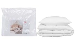 Tuotteiden kangas on ihanan pehmeää mikropolyesteriä. Täytteenä tyynyissä on kimmoisaa polyesteripallokuitua 390 g ja peitossa kuohkeaa polyesterispiraalikuitua 500 g. Peiton mitat on 150 x 200 cm ja tyynyn mitat 50 x 60 cm.